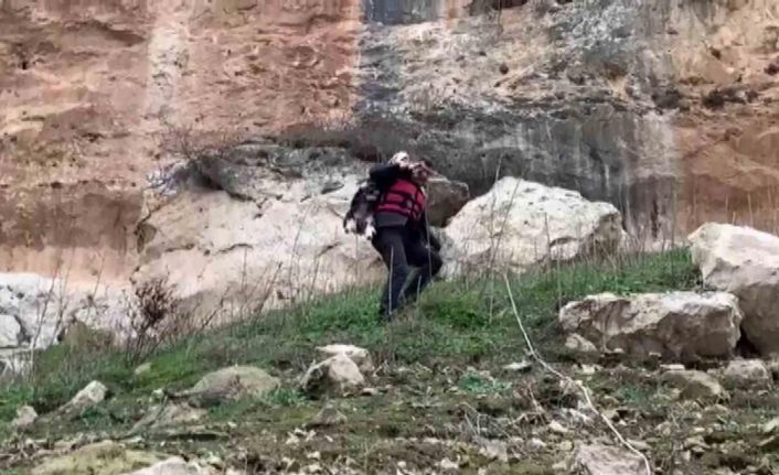 Batman’da itfaiye eri, kayalıklarda mahsur kalan keçiyi sırtında taşıyarak aşağı indirdi.
