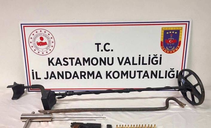 Edinilen bilgiye göre, Kastamonu İl Jandarma Komutanlığınca tarihi eser kaçakçılığının önlenmesine yönelik yapılan çalışmalar neticesinde E.K. ve T.D. isimli şahıslar, Kastamonu’nun Merkez ilçesinde define bulmak maksadıyla izinsiz kazı yaptıkları esnada suçüstü yakalandı. Şahıslarla birlikte jandarma ekiplerince yapılan aramada 1 adet ruhsatsız tabanca, 1 adet arama dedektörü, 4 adet altın arama çubuğu ve 14 adet tabanca mermisi ele geçirildi.
