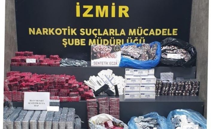 İzmir Emniyet Müdürlüğüne bağlı Narkotik Suçlarla Mücadele Şube Müdürlüğü ekipleri tarafından Karabağlar ilçesinde bulunan bir ikamette gerçekleştirilen operasyonda 154 bin adet kırmızı ve yeşil reçeteyle satılan sentetik ecza, 1 adet ruhsatsız tabanca ve 8 adet tabanca fişeği ele geçirildi.