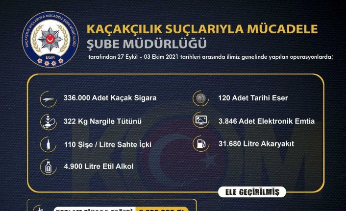 İzmir İl Emniyet Müdürlüğü Kaçakçılık Suçlarıyla Mücadele Şube Müdürlüğü ekipleri, 27 Eyül-3 Ekim arasında kent genelinde kaçakçılıkla mücadele kapsamında 12 ayrı operasyon düzenledi. Operasyonlardaki aramalarda, piyasa değeri 3 milyon 600 bin lira olan 336 bin kaçak sigara, 322 kilogram nargile tütünü, 110 litre sahte içki, 4 bin 900 litre etil alkol, tarihi eser niteliğinde olduğu belirtilen 120 obje, 3 bin 846 sahte elektronik malzeme ve 31 bin 680 litre kaçak akaryakıt ele geçirildi.