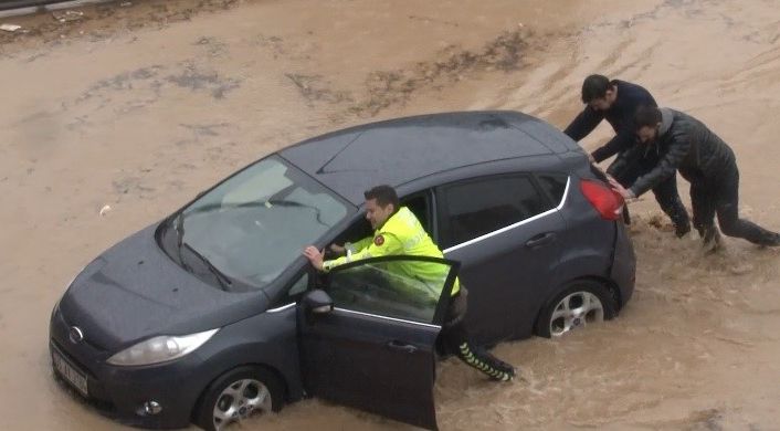 İzmir’de gece boyunca etkili olan sağanak yağmur seli beraberinde getirdi. Sel sularında mahsur kalan araç sürücüleri yardım beklerken imdadına trafik polisleri yetişti.