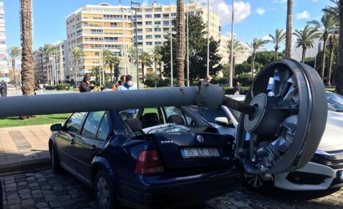 İzmir’in Konak ilçesinde 25 metrelik aydınlatma direği, fırtınadan dolayı park halindeki 5 aracın üzerine devrilirken, araçlarda maddi hasar oluştu. Dev direğin devrilmesi esnasında kimsenin olmaması herkese rahat bir nefes aldırdı.