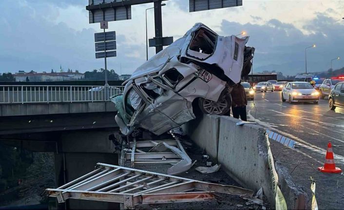 İzmir’in Buca ilçesinde freni boşalan iş makinesi yüklü kamyonun önündeki otomobile çarpması sonucu meydana gelen kazada 3 kişi yaralandı. Çarpmanın etkisiyle otomobil köprüde asılı kalırken, kamyonun kasasındaki iş makinesi metrelerce yükseklikten aşağı düştü.