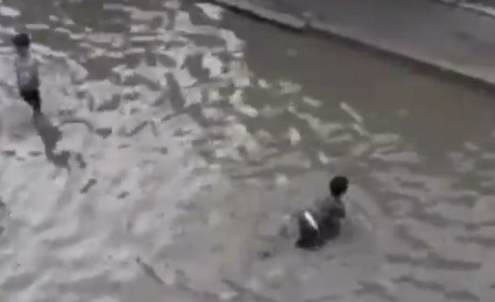İzmir’in Bornova ilçesinde sağanak yağışta bir çok sokak göle dönerken, çocuklar biriken yağmur suyunda yüzerek eğlendi.