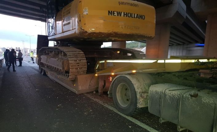 İzmir’de iş makinesi yüklü tır köprüde sıkıştı