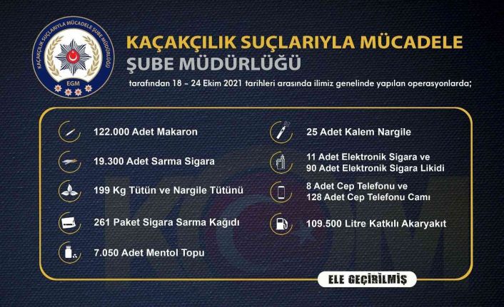 İzmir İl Emniyet Müdürlüğü Kaçakçılık Suçlarıyla Mücadele Şube Müdürlüğü ekipleri, 18-24 Ekim tarihleri arasında kent genelinde 11 operasyon gerçekleştirdi. Operasyonlarda adreslerde yapılan aramalarda, 122 bin makaron, 19 bin 300 adet sarma sigara, 199 kilogram tütün ve nargile tütünü, 261 paket sigara sarma kağıdı, 7 bin 50 adet mentol topu, 25 adet kalem nargile, 11 adet elektronik sigara, 90 adet elektronik sigara, 8 adet cep telefonu, 128 adet cep telefonu camı ve 109 bin 500 litre katkılı akaryakıt ele geçirildi.