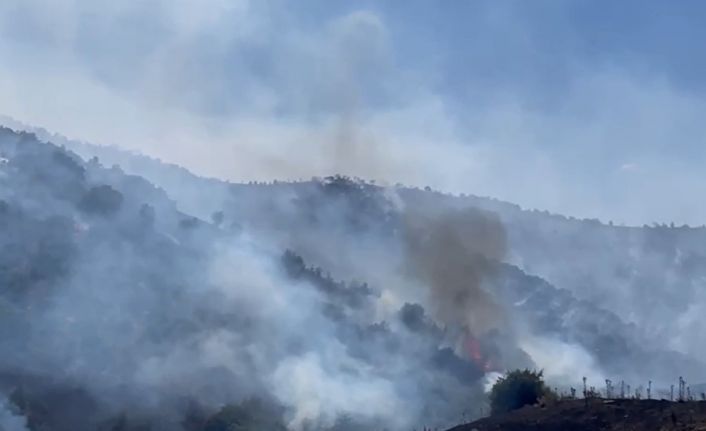 İzmir Kiraz ilçesinde, makilik alanda çıkan yangına ekipler havadan ve karadan müdahale ediyor.