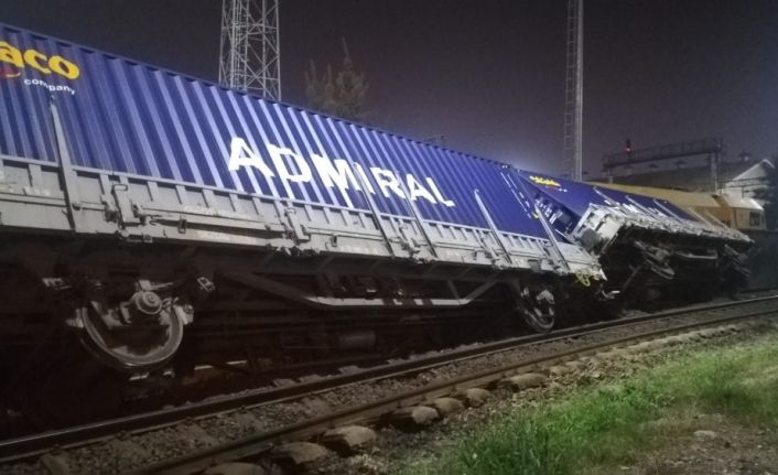 İzmir’in Konak ilçesinde mermer taşıyan konteyner yüklü yük treni devrildi.