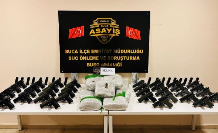 Buca İlçe Emniyet Müdürlüğü Suç Önleme ve Soruşturma Büro Amirliği ekipleri, ilçede yasadışı silah ticareti yaptığı belirlenen şüphelileri tespit etti. M.Y. ve M.Ç. olarak kimlikleri belirlenen şüphelilerin evine operasyon gerçekleştiren ekipler, 37 adet ruhsatsız tabanca, tabancalara ait şarjörler ve 13 kilogram skunk maddesi ele geçirdi.