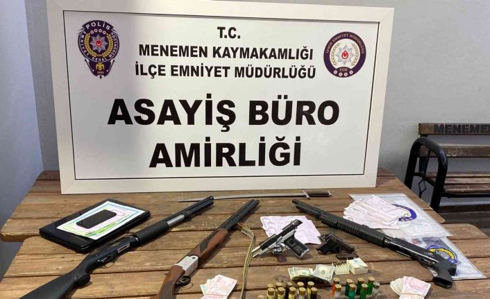 İzmir’in Menemen ilçesinde, polis ekiplerince suç örgütüne yönelik 5 farklı adrese düzenlenen operasyonda 4 şüpheli gözaltına alındı. Yapılan aramalarda tabanca, pompalı tüfek, bir miktar para, çok sayıda kişi üzerine düzenlenmiş senet ve kılıç ele geçirildi.
