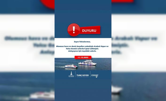 İzmir’de olumsuz hava ve deniz koşulları nedeniyle tüm vapur seferlerin iptal edildiği açıklandı. İZDENİZ tarafından yapılan açıklamada, "Olumsuz hava ve deniz koşulları sebebiyle araba vapur ve yolcu gemisi seferleri iptal edilmiştir. Anlayışınız için teşekkür ederiz" ifadelerine yer verildi.