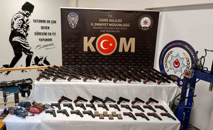 İzmir İl Emniyet Müdürlüğü Organize Şube Müdürlüğü ekipleri, yasa dışı silah imalatı ve ticaretini önlemeye yönelik saha ve analiz çalışmaları yürüttü. Çalışmalar neticesinde, suçu gerçekleştiren S.G., O.E., O.K. ve M.A. isimli 4 kişi takip edildi. Yürütülen teknik ve fiziki takibin ardından düğmeye basan polis ekipleri, şüphelilerin ikamet ve araçlarına eş zamanlı operasyon gerçekleştirdi. Operasyonda 4 şüpheli de yakalanarak gözaltına alındı. Adreslerde yapılan aramalarda ise, 120 adet çevirmeye hazır kuru sıkı tabanca, 188 şarjör, 3 ruhsatsız tabanca, 359 fişek, 99 silah parçası, 1 adet hidrolik pres makinesi, 1 dremel makinesi, 6 matkap ve silah imalatında kullanılan çok sayıda malzeme ele geçirildi.