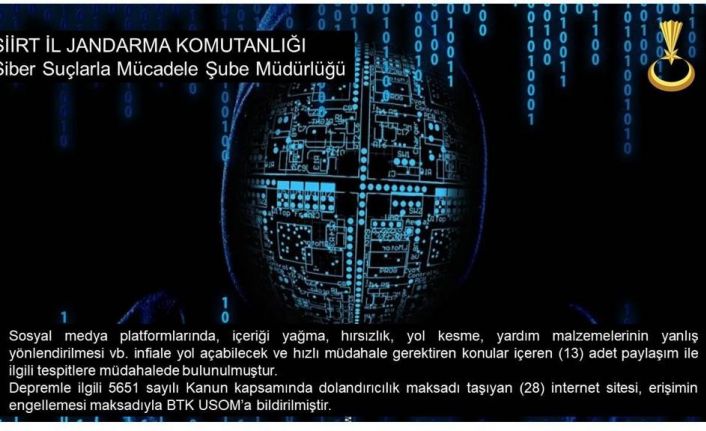 Siirt İl Jandarma Komutanlığı Siber Suçlarla Mücadele Şube Müdürlüğü, sosyal medya üzerinden işlenen suçlara yönelik çalışmalara devam ediyor. Konuyla ilgili açıklamada, "Çalışmalar çerçevesinde, Siirt İl Jandarma Komutanlığı Siber Suçlarla Mücadele Şube Müdürlüğünce; 06 Şubat 2023 tarihinde Kahramanmaraş ve çevre illerde meydana gelen deprem olayı ile ilgili olarak sosyal medya platformlarında ve açık kaynaklarda herkese açık olarak paylaşım yapan 2 bin 786 hesap üzerinde çalışma yapılmış, suç içerikli olabileceği değerlendirilen 116 adet paylaşım tespit edilmiş, kimlik tespiti yapılan 18 adet hesap ile ilgili tanzim edilen raporlar ilgili birimlere gönderilmiştir. Sosyal medya platformlarında, içeriği yağma, hırsızlık, yol kesme, yardım malzemelerinin yanlış yönlendirilmesi gibi infiale yol açabilecek ve hızlı müdahale gerektiren konular içeren 13 adet paylaşım ile ilgili tespitlere müdahalede bulunulmuştur" denildi.