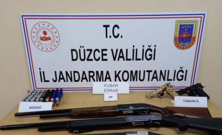 Düzce Valiliğinden yapılan açıklamada Yığılca ilçesinde bir şahsın evinde yapılan aramada silah, tüfek ve uyuşturucu ele geçirildiği bildirildi. Açıklamada, “Düzce ili Yığılca ilçesi İlçe Jandarma Karakol Komutanlığı sorumluluk alanı İçinde uyuşturucu madde kullandığı değerlendirilen A.A.’nın ikamet adresine Yığılca Sulh Ceza Mahkemesinin arama kararı istinaden arama yapıldı. Yapılan aramada 5 gram kubar esrar, 2 adet ruhsatsız tabanca, 3 adet ruhsatsız av tüfeği ve 49 adet av tüfeği mühimmatı ele geçirildi. Cumhuriyet Savcılığının talimatları doğrultusunda adli tahkikata başlanılmıştır” denildi.