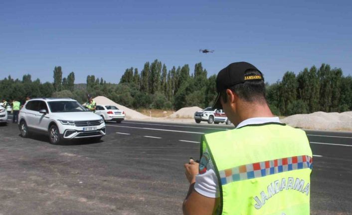 Beyşehir’in Üstünler kavşağında dronla uygulama yapan jandarma trafik timleri, sürücülerin emniyet kemeri, araçta cep telefonu kullanımı ile hatalı sollama yapıp yapmadığını havadan tespit etti.