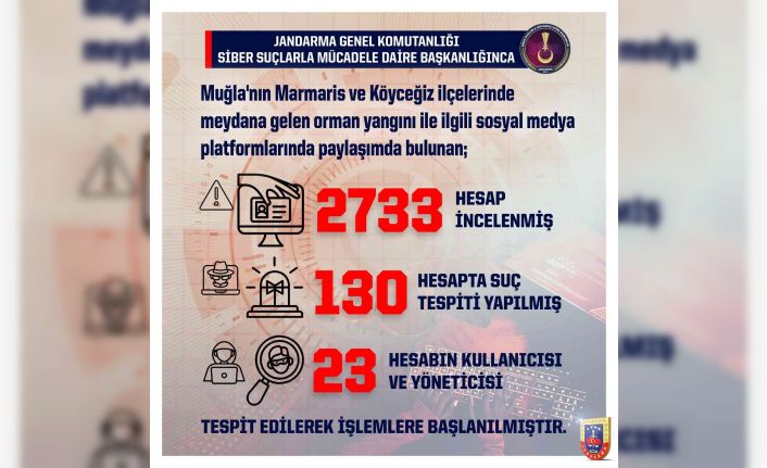 Jandarma Genel Komutanlığı tarafından Muğla’daki orman yangını hakkında sosyal medya üzerinden suç içerikli paylaşımlarda bulunan şahısların tespit edildiğine dair yapılan açıklamada, "Jandarma Genel Komutanlığı Siber Suçlarla Mücadele Daire Başkanlığınca, Muğla’nın Marmaris ve Köyceğiz ilçelerinde meydana gelen orman yangını ile ilgili sosyal medya platformlarında paylaşımda bulunan 2 bin 733 hesap incelenmiş, 130 hesapta suç tespiti yapılmış, 23 hesabın kullanıcısı/yöneticisi tespit edilerek işlemlere başlanılmıştır" denildi.