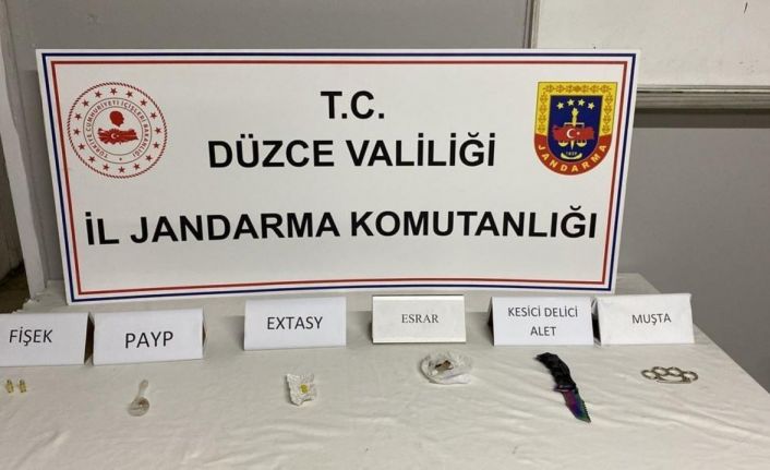 Düzce’de jandarma ekiplerinin uyuşturucu ile mücadelesi sürüyor. Düzce İl Jandarma Komutanlığı ekiplerince icra edilen yol emniyet ve kontrol ile önleyici kolluk devriyelerinde 23 araç içerisinde bulunan 43 şahıs arandı. Şahısların araç ve üzerlerinde 44 gram Metamfetamin, 90 gram kubar esrar, 60 gram eroin, 6 gram kokain, 8 gram kenevir tohumu, 60 kök kenevir bitkisi, 6 gram Bonzai, 18 adet uyuşturucu hap, 10 adet uyuşturucu madde kullanma aparatı, 3 adet 7,65 mm fişek, bıçak, muşta ve 2 adet hassas terazi ele geçirilmiştir.