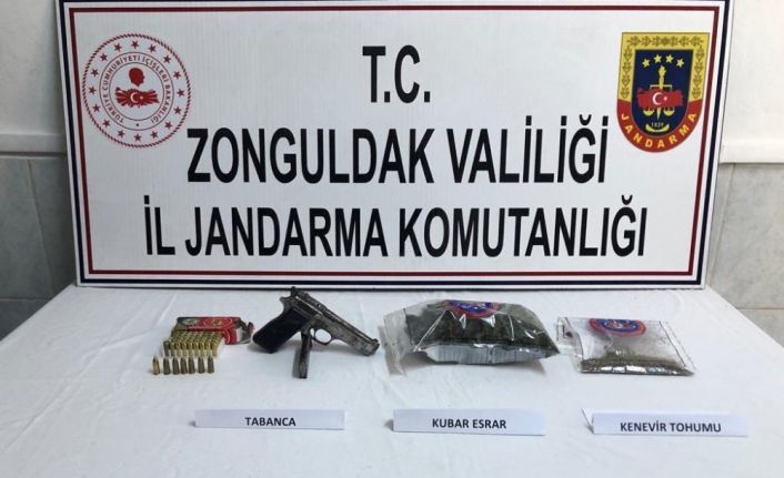 Edinilen bilgiye göre Zonguldak İl Jandarma Komutanlığı ekipleri tarafından Kilimli İlçe Jandarma Komutanlığı ve Jandarma İstihbarat Şube Müdürlüğü tarafından yapılan istihbarı çalışmalar neticesinde Kilimli İlçesi Ayiçi Mahallesi’nde ikamet eden M.Ç (48) isimli şahsın evinde uyuşturucu madde bulunduğu bilgisini alan ekipler harekete geçti. Ekipler tarafından şahsın evinde yapılan aramada 268 gram kubar esrar, 143 gram kenevir tohumu, 1 adet ruhsatsız 9 mm tabanca, 1 adet şarjör, 48 adet TL 9 mm (MKE marka) tabanca fişeği ele geçirildi. Olay ilgili ekipler tarafından yakalanan şahıs gözaltına alındı.