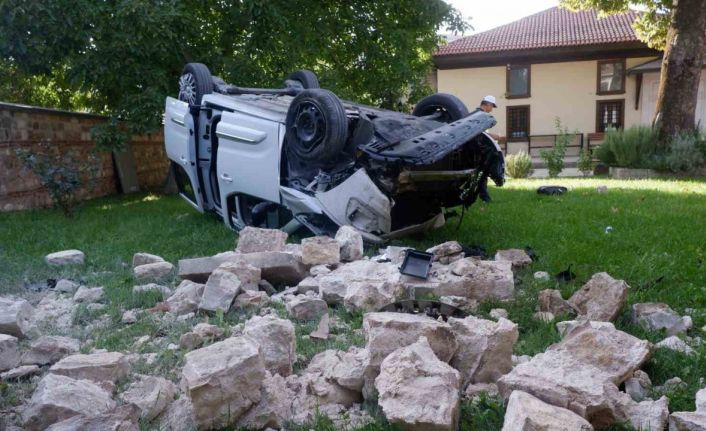 Edirne’de polisin "dur" ihtarına uymayan göçmen kaçakçısı şüphelinin kullandığı panelvan camii bahçesine uçtu. Ağır hasar oluşan araç, vinç yardımıyla otoparka kaldırıldı.