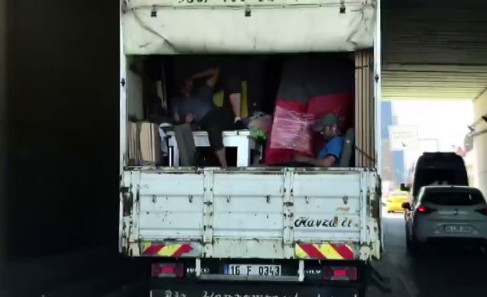 Kadıköy’de D-100 karayolunda Göztepe yönüne doğru seyir halindeki kamyon, sürücülerin dikkatini çekti. Masa ve sandalyelerle yüklü kamyonun kasasındaki 2 kişi, korunaksız olarak seyahat ederken, bu anlar başka sürücü tarafından kayda alındı. Kamyon kasasında, yüklerin üzerinde giden kişilerin rahat tavırları ise dikkat çekti.Kadıköy’de kamyonet kasasında tehlikeli yolculuk