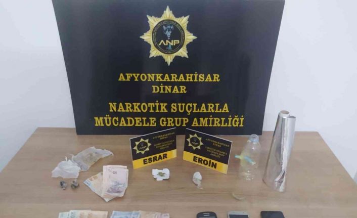 Dinar İlçe Emniyet Müdürlüğüne bağlı Narkotik Suçlarla Mücadele Şube Amirliği ekipleri ilçede uyuşturucu madde ticareti yapan şahıslara yönelik operasyonlarına devam ediyor. Ekipler dün ilçede kontrol için girdiği otelde kalan şahısların odasında arama yaptı. Aramada odadaki kadın şahsın iç çamaşırının içerisinde 11.43 gram eroin ele geçirirken, odada ise 1.10 gram esrar, 1 adet bong aparatı, 2 adet içinde uyuşturucu kalıntıları bulunan poşet, 3 adet cep telefonu, bin 265 TL ele geçirildi. Olayın ardından üzerinden eroin çıkan kadınla birlikte bir kişi daha gözaltına alındı.