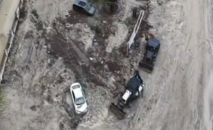 Dron ile havadan kaydedilen görüntülerde, dere yatağının taştığı ve yolların su altında kaldığı, birçok noktada çamur ve balçık birikintilerinin oluştuğu görüldü.
