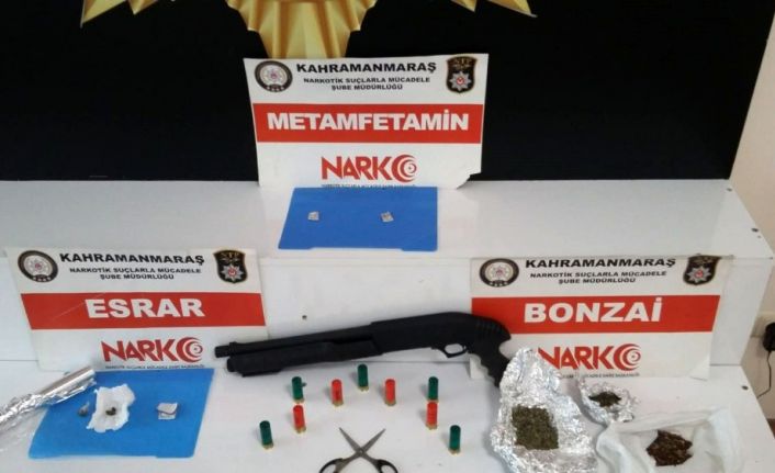 Şahıslardan bir miktar esrar, metamfetamin, bonzai, sentetik hap, 1 adet ruhsatsız silah da ele geçirildi.