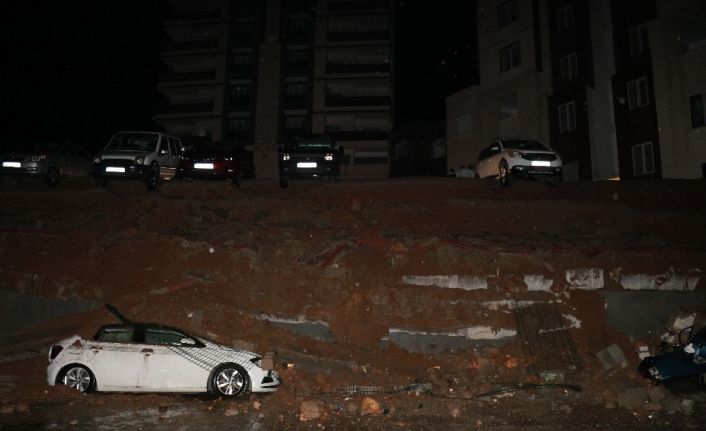 Kahramanmaraş’ta etkili olan yağmur nedeniyle bir sitenin istinat duvarı çökerken, göçüğün altında kalan 3 otomobil hurdaya döndü.