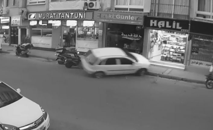 Mersin’de kontrolden çıkan otomobil önce park halindeki motosikletlere ardından kaldırıma çıkıp bir iş yerinin vitrinine çarptı. Güvenlik kameralarına yansıyan kazada, araç sürücüsüyle birlikte 3 kişi hafif yaralandı. Kaldırımda yürüyen çok sayıda kişi de saniyelerle ezilmekten kurtuldu.