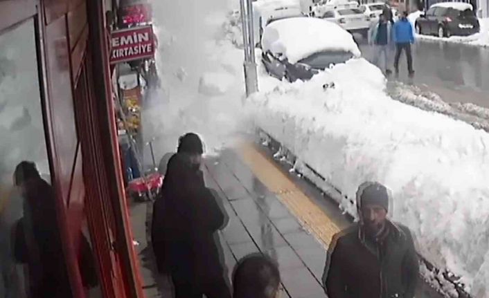 Merkeze bağlı Atatürk Bulvarı Bankalar Caddesi’ndeki 2 katlı bir iş yerinin çatısında biriken kar kütlesi, büyük bir gürültüyle yere düştü. Gürültüyü fark ederek bulundukları yerden kaçan vatandaşlar, ölümden saniyelerle kurtuldu. Vatandaşların kar kütlesinin altında kalmaktan saniyelerle kurtulduğu o an ise bir iş yerinin güvenlik kamerasına yansıdı.