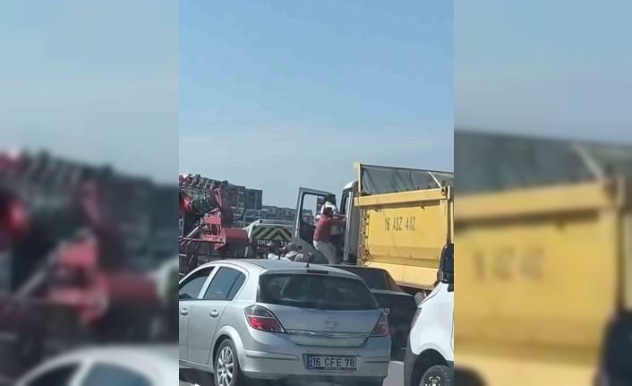 Olay, merkez Yıldırım ilçesi Millet Mahallesi mevkiinde meydana geldi. Akşam trafiğinin yoğun olduğu saatlerde seyir halindeki bir otomobilin sürücüsü ile anayolda ilerleyen kamyon sürücüsü iddiaya göre yol verme tartışması nedeniyle kavgaya tutuştu. Öfkeli otomobil sürücüsü, araçtan indiği arkadaşıyla kamyonun kupa kısmına tırmanıp, kamyon şoförünü darp etti. O anları gören bazı vatandaşlar kavgaya tutuşan tarafları ayırmaya çalışırken, kimisi de klaksonlarla tepki gösterdi. Tarafların güçlükle ayırıldığı kavga anı ise amatör kameraya yansıdı.