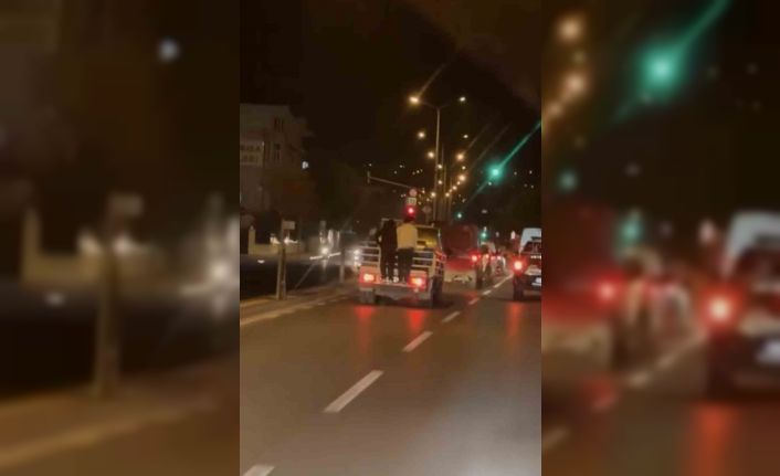 Olay, 35’lik yol üzerinde meydana geldi. Seyir halindeki kamyonetin arkasına asılan duyarsız gençlerin tehlikeli yolculuğu, vatandaşların cep telefonu kamerasına saniye saniye yansıdı. Kaza tehlikesini umursamayan gençlerin pişkin halleri görenleri hayrete düşürürken, o anlar yürekleri ağızlara getirdi.