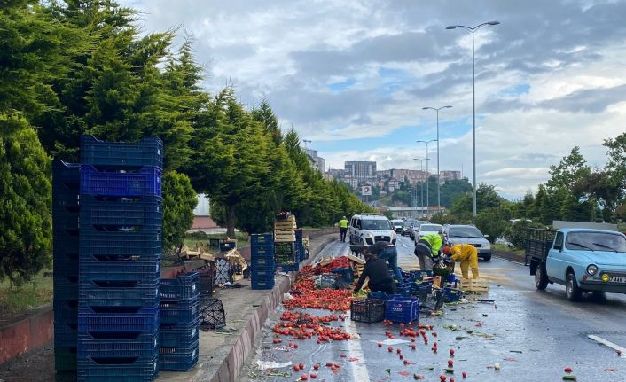 Zonguldak’ta lastiği patlayan kamyonet devrildi. Sebze ve meyveler yola saçıldı.