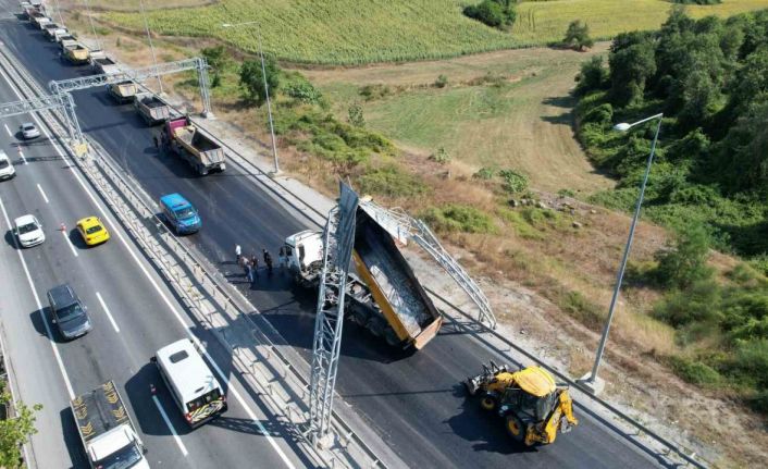 Edinilen bilgiye göre, Arnavutköy Tayakadın mevkiinde saat 17.00 sıralarında Karayolları Genel Müdürlüğü’nün asfaltlama çalışması yürüttüğü Hastal-Kemerburgaz yolunda ilginç bir kaza yaşandı. İddiaya göre, kapalı yolda asfalt dökümünün ardından hafriyat kamyonunun damperi açık unutuldu. Araç yoluna devam edince açık unutulan damper yönlendirme levhasına çarptı. Tabelalar ve kamyonda hasar oluştu. Oluşan hasar dron kamerasıyla görüntülendi.