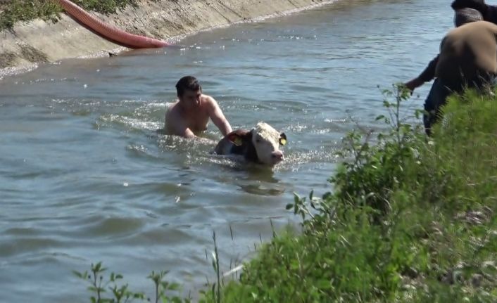 Kanala düşen buzağı ve anne inek itfaiye ekiplerince kurtarıldı