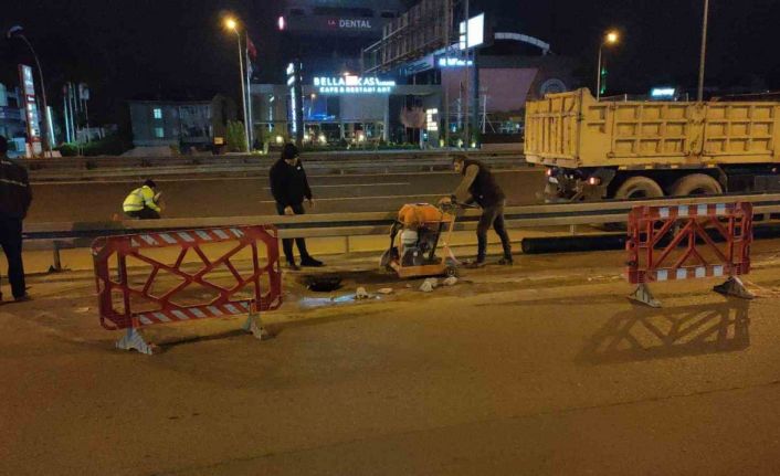 Kocaeli’de D-100 yan yolda kanalizasyondan kaynaklı olarak asfalt üzerinde biriken su, yolun çökmesine sebep oldu. Ekipler, çöken yolda olumsuzluk yaşanmaması için önlem alırken tahribatı düzeltmek için çalışmalarını sürdürüyor.