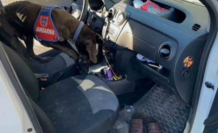 Aksaray’da şüphe üzerine durdurulan araçta arama yapan jandarma narkotik köpeği ’Kaput’, araç vitesinin altına gizlenmiş uyuşturucuları burnuyla tespit edip, patisiyle çıkardı.