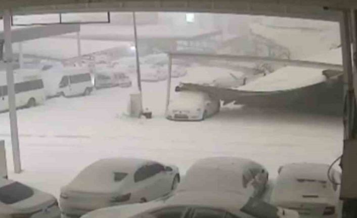 Kar ağırlığına dayanamayan sundurmanın araçların üzerine çöktüğü anlar kamerada