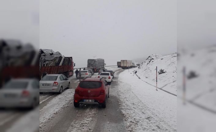 Tokat’ta 1650 rakımlı tepeden geçen sürücüler aniden bastıran kar yağışı nedeni ile yolda kaldı.