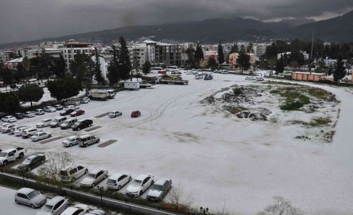 Hatay’ın Dörtyol ilçesinde etkili olan sağanak yağışın ardında kısa süreli dolu yağışı ilçeyi adeta beyaza bürüdü.