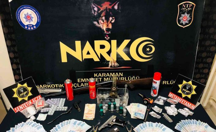 Operasyonun düğmesine dün sabaha karşı basıldı. Cumhuriyet Başsavcılığının koordinesinde Karaman Emniyet Müdürlüğü Narkotik Suçlarla Mücadele Şubesi ekipleri, kentte uyuşturucu ticareti yapanlara yönelik Karaman merkez başta olmak üzere Gaziantep, Konya ve Antalya illerinde eş zamanlı olarak operasyon yaptı. Resmi ve sivil olmak üzere çok sayıda polisin katıldığı operasyonda 2’si kadın 18 kişi evlerinde yakalanarak gözaltına alınmıştı. Şüphelilerin evlerinde yapılan aramalarda ise 230 gram metamfetamin, 100 gram esrar, 15 gram eroin, 120 adet reçeteye tabi hap, 1 adet tabanca, 21 adet mermi, 1 adet tüfek ve uyuşturucudan elde edildiği düşünülen 6 bin 815 TL ele geçirildi.