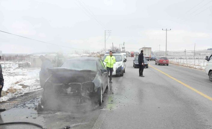 Karaman’da seyir halindeki bir otomobil bir anda alev topuna döndüğü anlar cep telefonuyla görüntülendi.