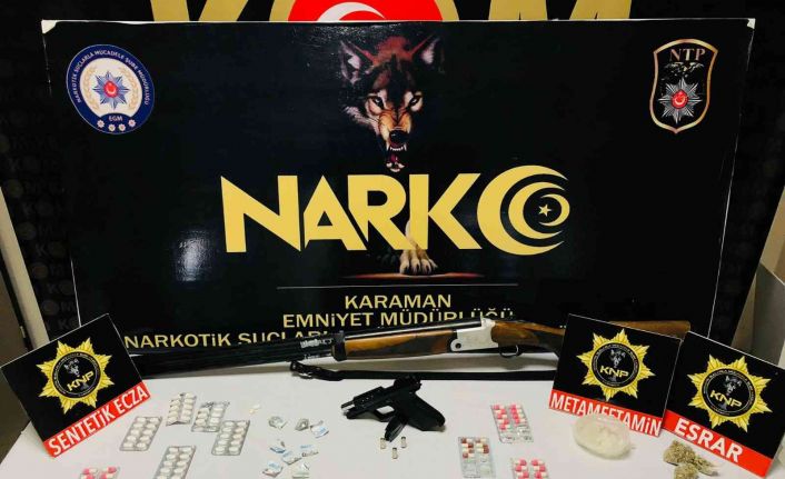Şüphelilerin evlerinde yapılan aramalarda ise 273 reçeteye tabi hap, 108,64 gram metamfetamin, 4 gram kenevir tohumu, 578 gram bonzai, 27,05 gram esrar, 0,60 gram eroin, 1 adet tüfek ve 1 adet kurusıkı tabanca ele geçirildi.