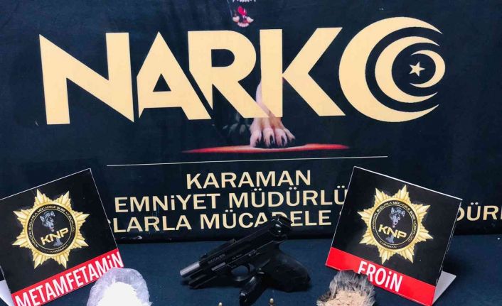 Edinilen bilgiye göre, Cumhuriyet Başsavcılığı tarafından yürütülen soruşturma kapsamında Karaman İl Emniyet Müdürlüğü Narkotik Suçlarla Mücadele Şubesi ekipleri, M.A ve A.A’yı uyuşturucu ticareti yaptıkları gerekçesiyle gözaltına aldı. Şüphelinin gösterdiği yerde yapılan aramada 10.30 gram eroin, 41.80 gram metamfetamin ile 1 adet tabanca ele geçirildi. Emniyetteki işlemlerin ardından adliyeye sevk edilen şüphelilerden M.A serbest kalırken, A.A, mahkemece tutuklanarak Karaman M Tipi Kapalı Cezaevine gönderildi.