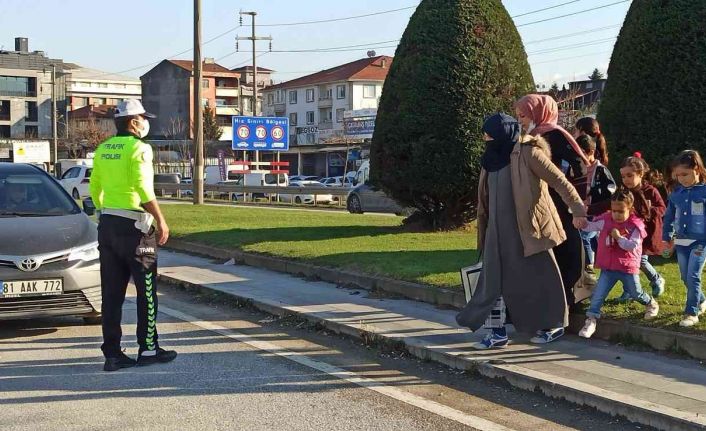 100 Karayolu üzerinde uygulama yapan trafik polisleri, yolun ortasında bekleyen çocukları ve annelerini karşıdan karşıya geçirmek için uygulamaya ara verdi. Çocukları ve annelerini güvenle karşıya geçiren ekipler, sonrasında görev başına döndü.