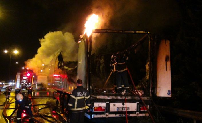 KOCAELİ (İHA) – TEM Otoyolu Kocaeli geçişinde kargo şirketine ait bir tırın dorse kısmı alev alev yandı. Yangın itfaiye ekiplerince söndürülürken, dorse kısmı ve içerisindeki kargolar yanarak kullanılamaz hale geldi.