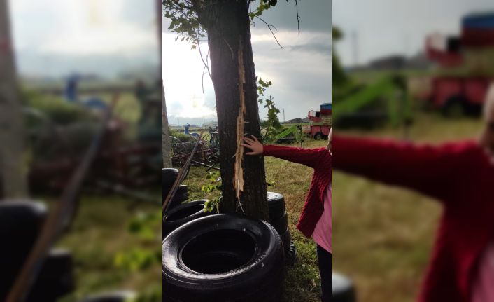 Kars’ta bir evin bahçesinde bulunan ağaca yıldırım düştü. Yıldırımın isabet ettiği ağaç ikiye bölündü.