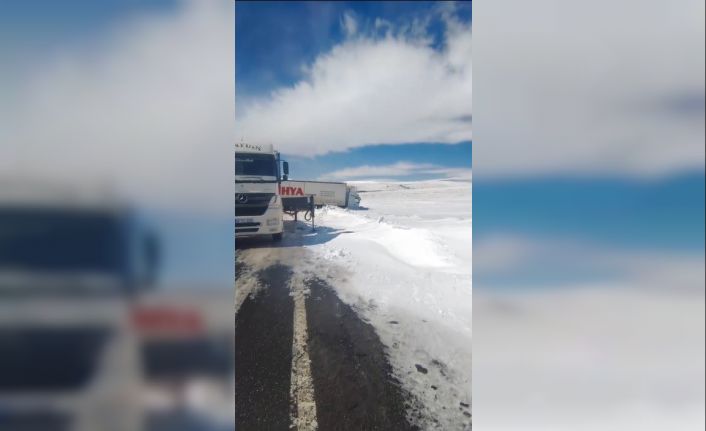 Kars’ta sürücüsünün direksiyon hakimiyetini kaybettiği tır, kayarak yolu kapattı.