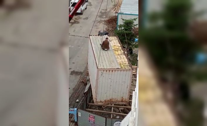 Kartal’da geçtiğimiz günlerde yaşanan olayda, vinç kasasında bulunan konteyner üzerine çıkan bir kişi vincin halatlarını konteynere bağladı. Halatları bağlayan kişi, vinç operatörünün konteyneri havaya kaldırmasıyla konteyner üzerinde kaldı. Konteyner üzerindeki kişi düşmemek için olduğu yere otururken, o anlara tanık olan vatandaşların yüreği ağza geldi. Konteyner üzerindeki kişinin düşmesinin işten bile olmadığı olayda, vinç operatörünün konteyneri yere indirmesiyle, konteyner üzerinde mahsur kalan kişi de yere inebildi. Çalışma yapan kişinin konteyner üzerinde mahsur kaldığı anlar cep telefonu kamerasına yansıdı.