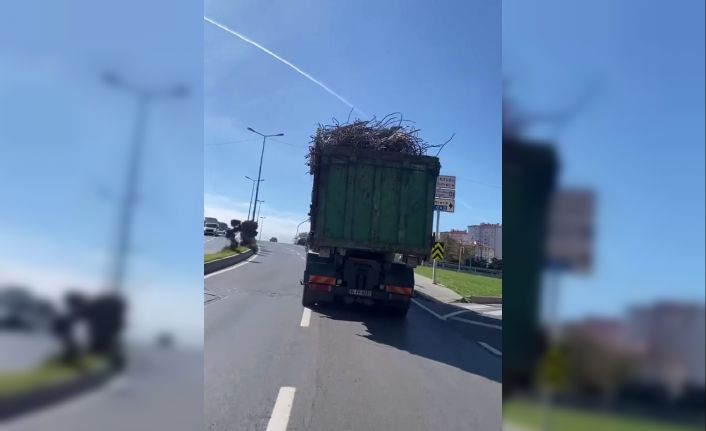 Beylikdüzü’nde kasasından yükselen demirle önlem almadan seyreden kamyon, vatandaşlar tarafından cep telefonu kamerasıyla görüntülendi. Kamyonun şoförüne ise bin 440 lira idari para cezası uygulandı.